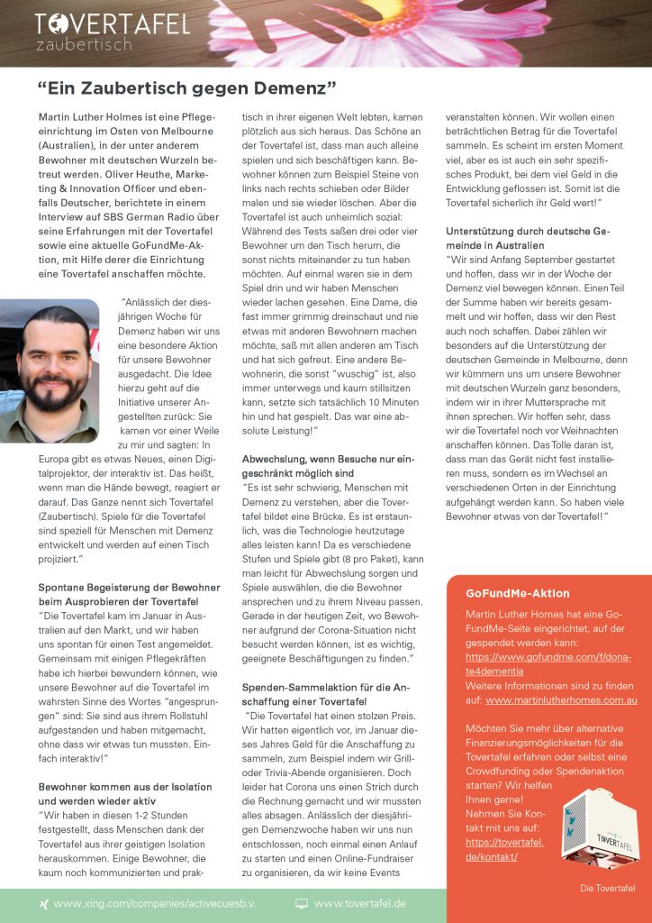 The Netherlands-based company, Active Cues, that has invented the magic Tovertafel has heard about our pledge to raise the funds here in Australia before Christmas and they were so impressed with our passion for their product that they have supported us online, on social media, and even with published articles in Germany, one of their biggest markets and also the home country of many of our residents at Martin Luther Homes.