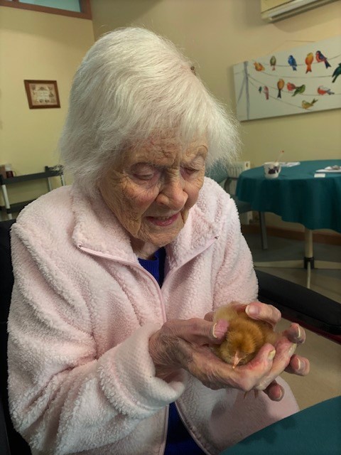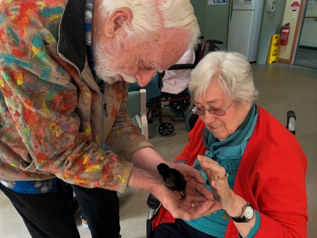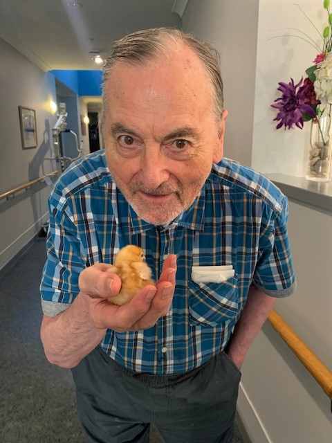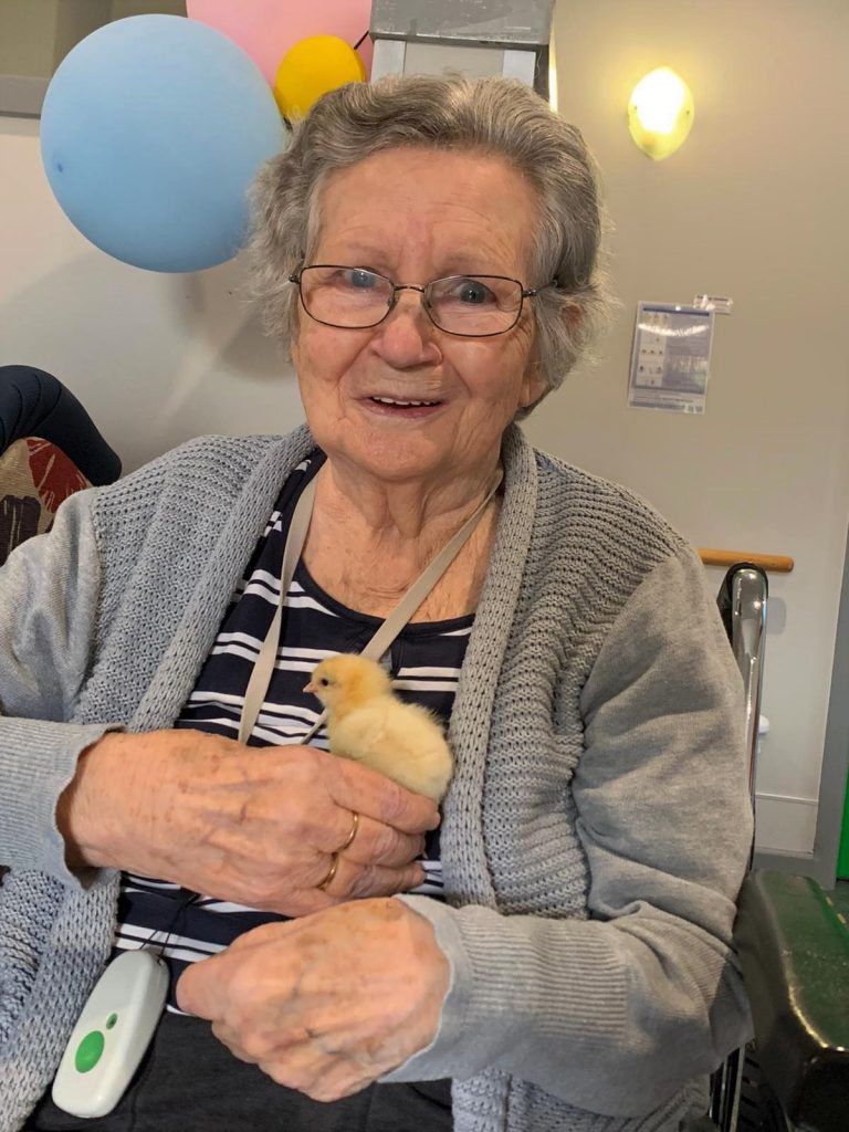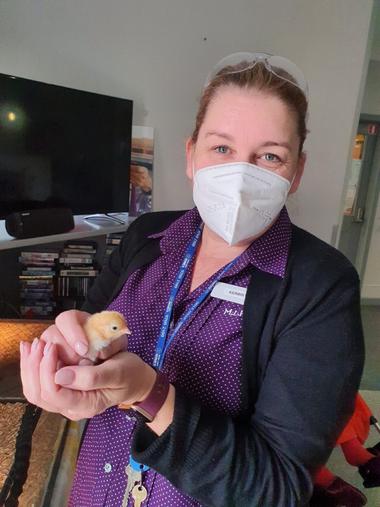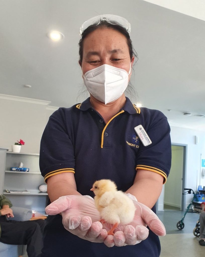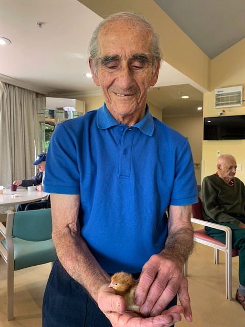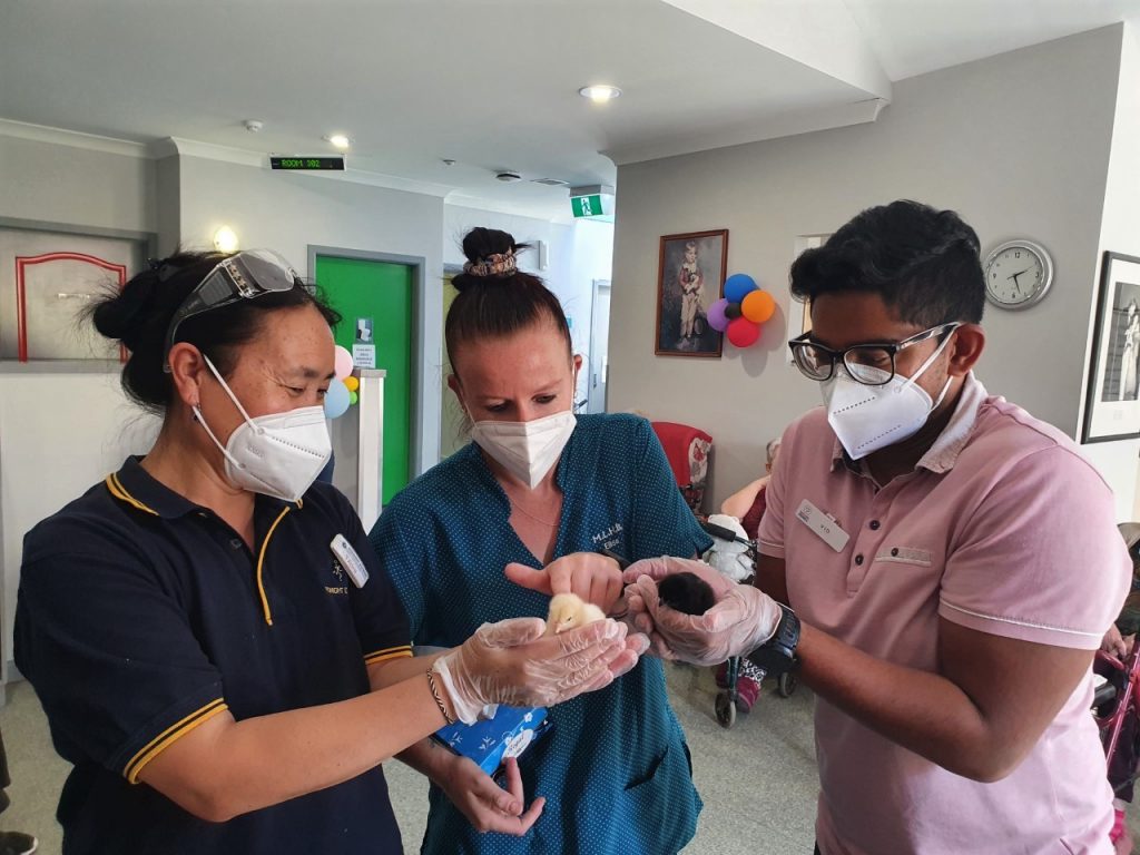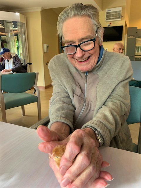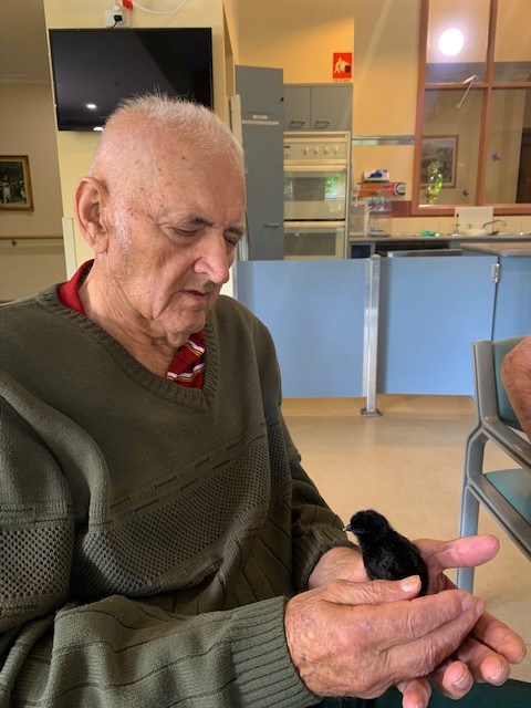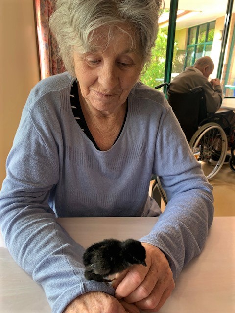 Our aged care residents (and staff) are able to watch eggs hatching in a specially designed incubator. After this, the hatched chicks can be observed at play in a large, clear-sided brooding pen. On the Henny Penny website, they describe it as follows: ‘In essence, we bring a little piece of the country to the city, making the wonder of Mother Nature accessible to all.’