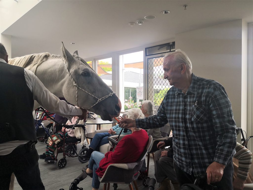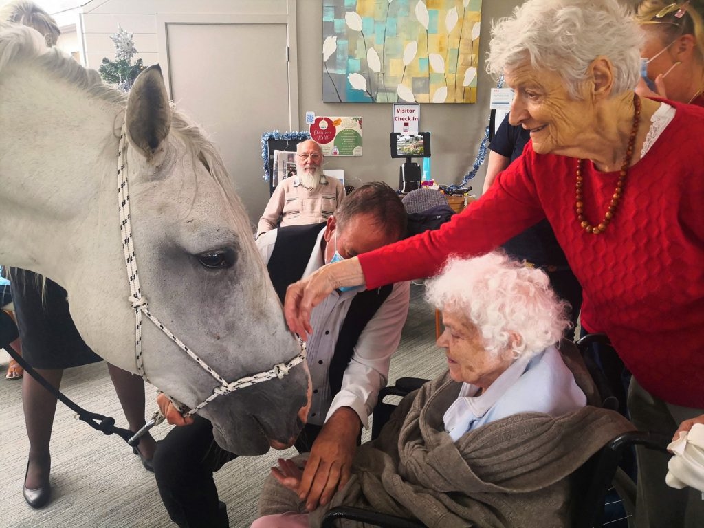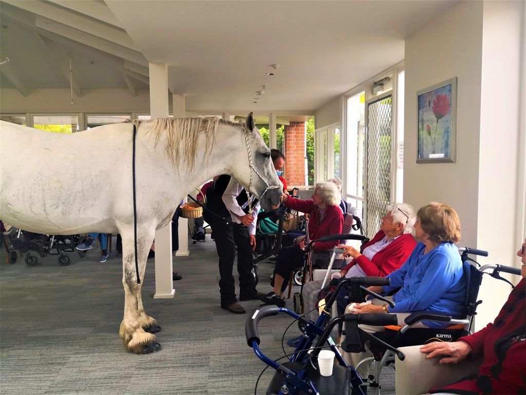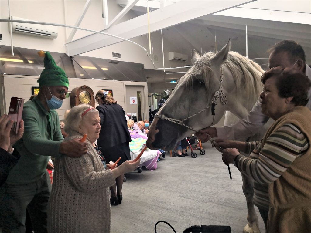 Our aged care residents were in for a big surprise! Everyone was asked to come to the Cafe Jensen. Our lifestyle staff David kept us entertained while we waited for a very special guest. This ‘guest’ was supposed to be meeting everyone outside but because of the rainy weather he came inside. Our residents couldn’t believe their eyes when Horace the horse entered the Cafe together with his owner. Horace is 15 year old stud who loves carrots. He was in for a treat! Residents and staff were giving him lots of carrots and ‘cuddles’. Everyone was in awe of this (big) horse who was happily and calmly munching his carrots. This is one of those occasions that we will remember for a long time to come! We can’t wait to see what our Activities Team has planned for the next year.