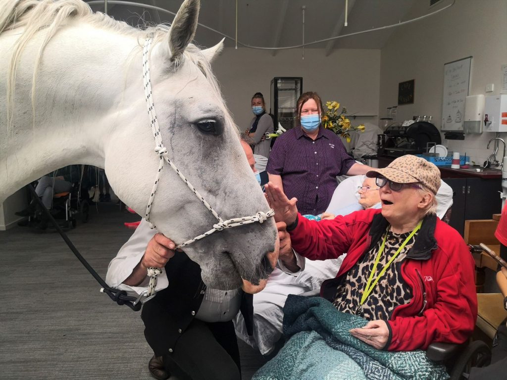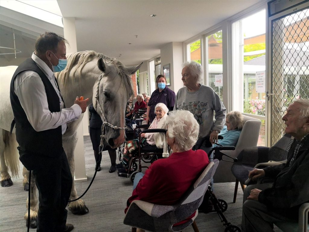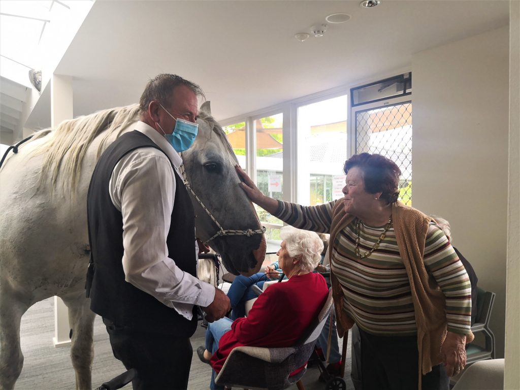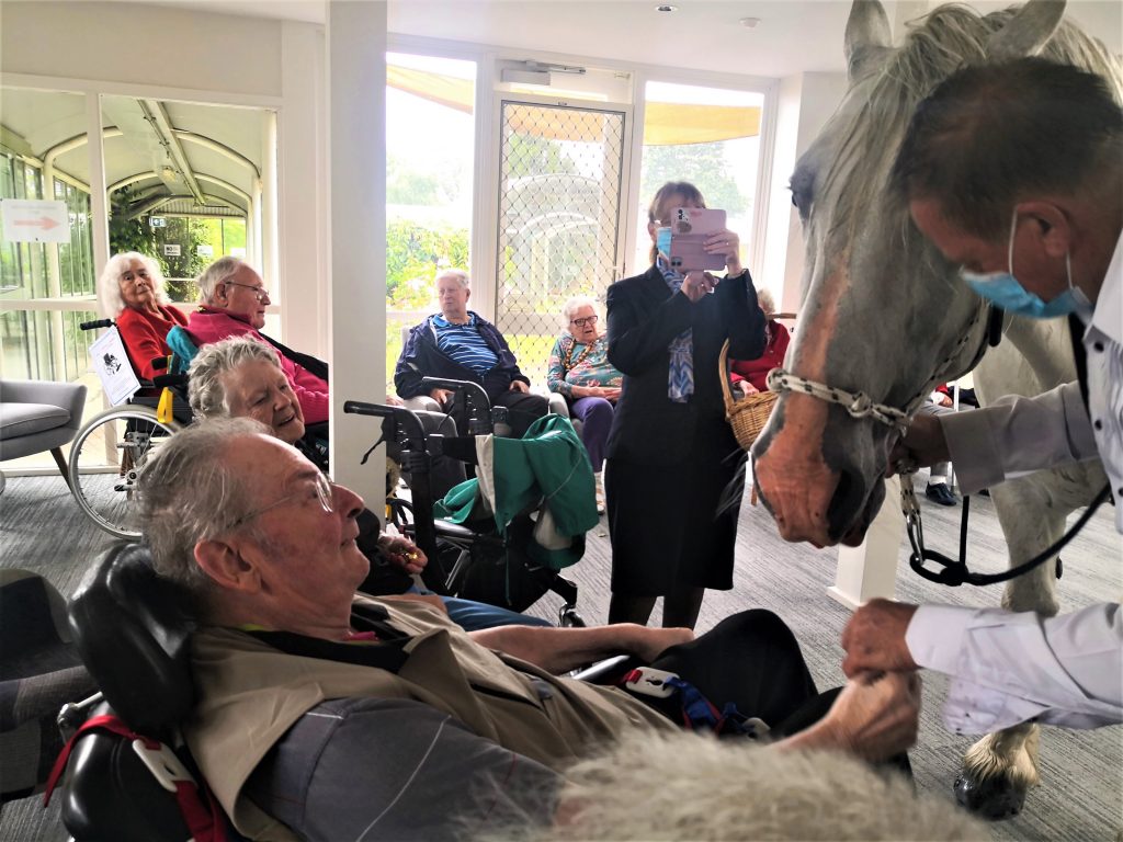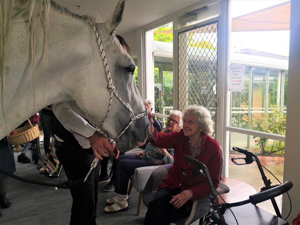 Our aged care residents were in for a big surprise! Everyone was asked to come to the Cafe Jensen. Our lifestyle staff David kept us entertained while we waited for a very special guest. This ‘guest’ was supposed to be meeting everyone outside but because of the rainy weather he came inside. Our residents couldn’t believe their eyes when Horace the horse entered the Cafe together with his owner. Horace is 15 year old stud who loves carrots. He was in for a treat! Residents and staff were giving him lots of carrots and ‘cuddles’. Everyone was in awe of this (big) horse who was happily and calmly munching his carrots. This is one of those occasions that we will remember for a long time to come! We can’t wait to see what our Activities Team has planned for the next year.