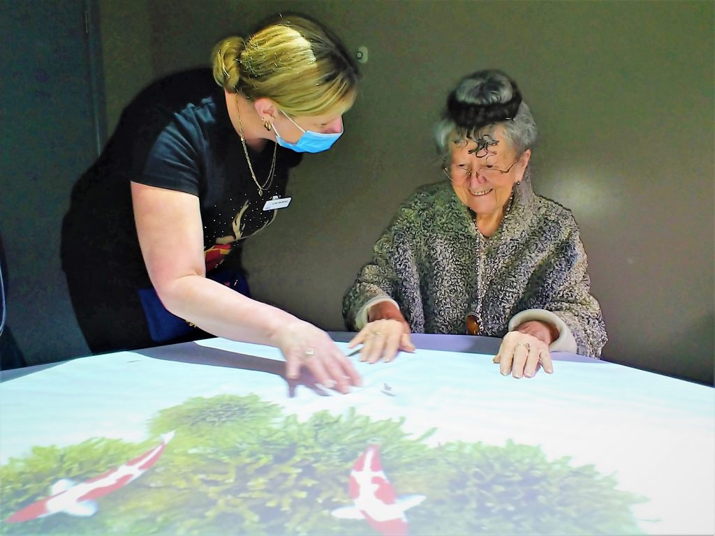 The fancy projector is now in daily use and quickly has become an important part of our daily activities calendar. Originally, we thought that the magic table had been exclusively designed for people with dementia but as we have soon discovered, many other residents also enjoy playing games on it. Even our physios are using the projector now for some of their exercises.