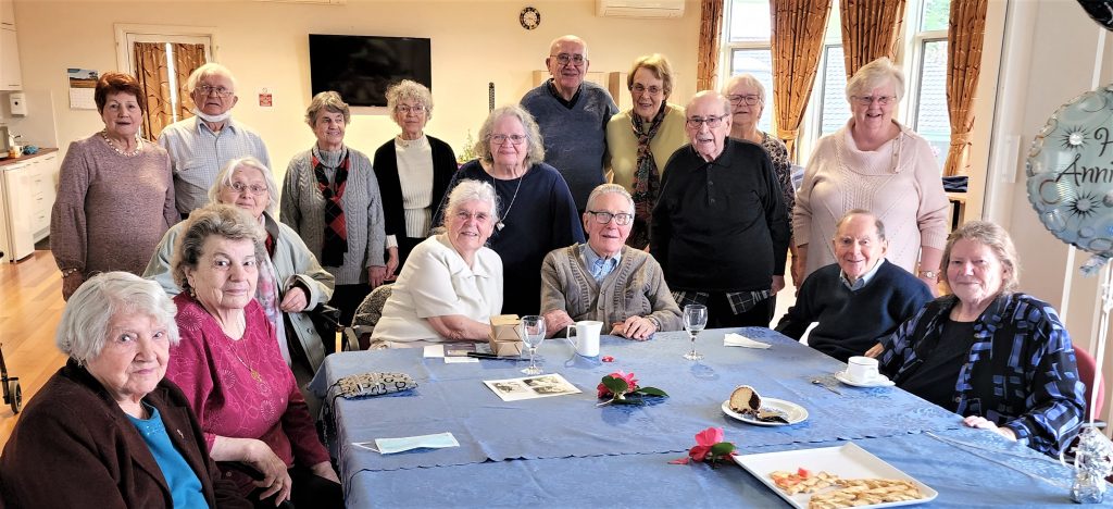Unsuspectingly, Christel and Horst were asked to stop by the Activity Room on their way out. The couple were surprised by our aged care residents in the beautifully decorated room and got congratulated by everyone. After a toast, they even had a dance together, just like in old times. When Christel and Horst left to go home, they were told that there is a second stopover. Our residents from the retirement village awaited the couple in the Community Hall with another surprise party in their honour. Horst and Christel enjoyed their special celebrations and thank everyone for the lovely afternoon!